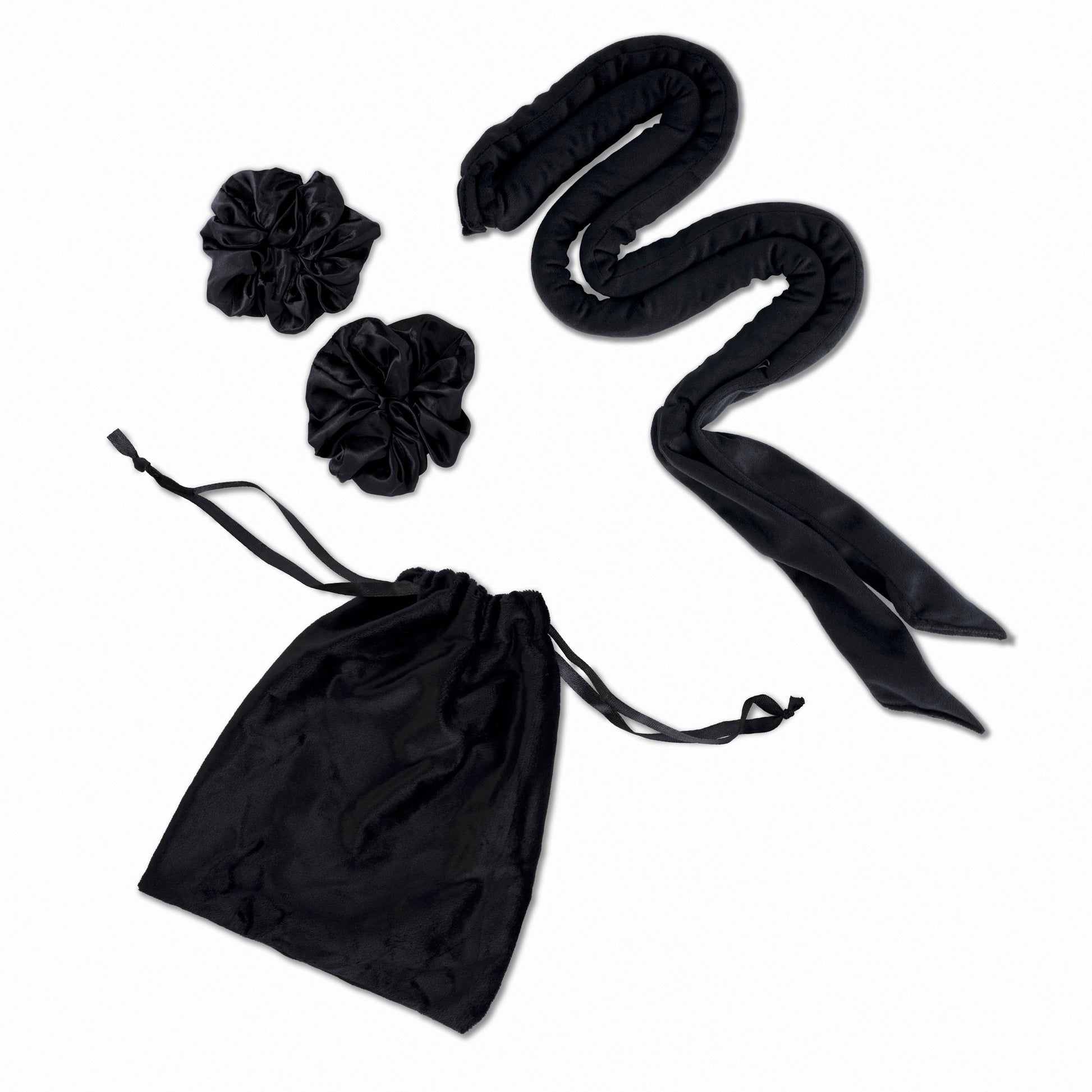 Saavuta kuumavabad lokid kõige mugavama ja funktsionaalsema lokipaelaga turul. Komplekt sisaldab musta lokipaela, kahte musta satiinist patsikummi ja sametist kotikest.
